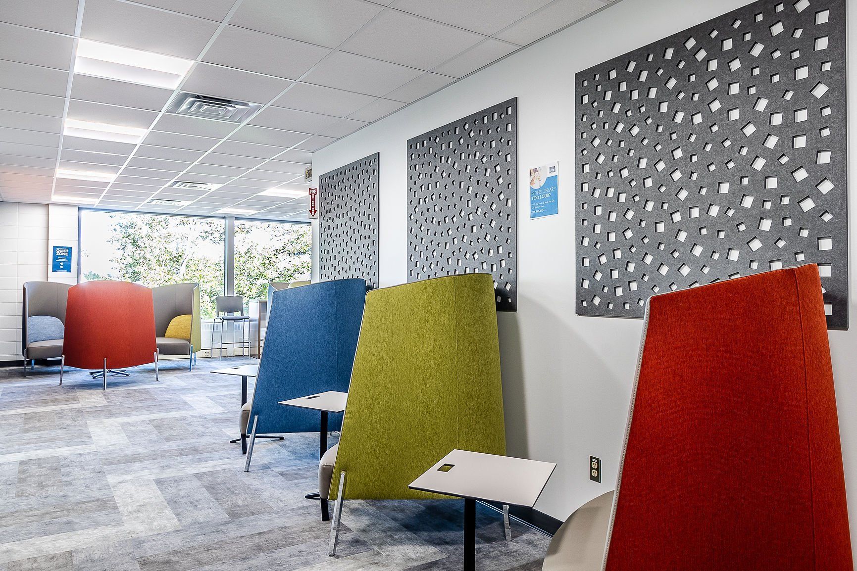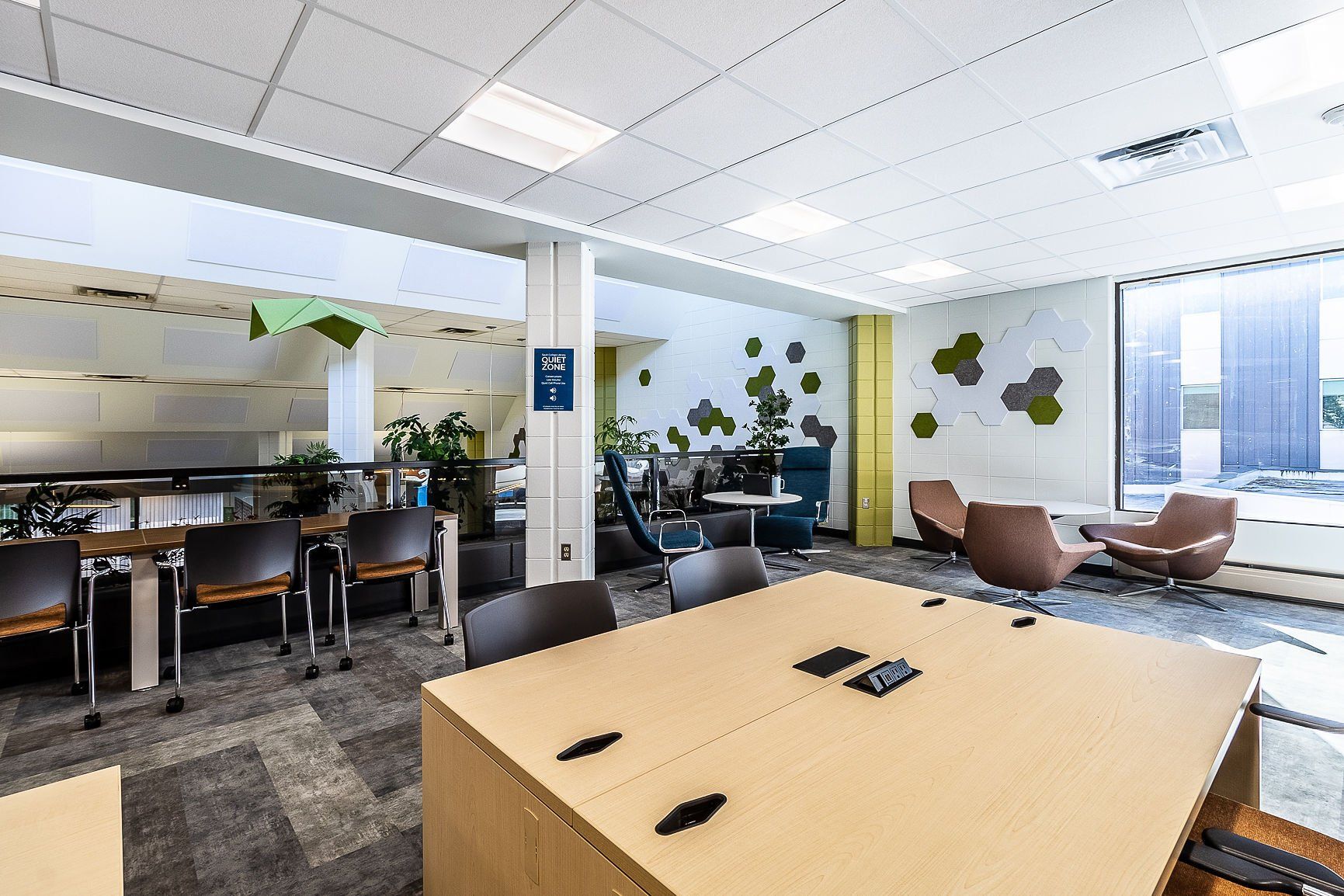 Although a much-needed replacement of old carpet and shelving and a paint refresh was incorporated, the most important addition to the space were integrated electrical outlets and USB ports to power laptop computers and cell phones. In the modern library, if there isn’t reachable power/USB connectivity, the space will be obsolete and go widely unused by students. The floor plan accommodated varying needs within each interactive space, and our staff were tasked with sourcing furnishings to complement the intended design and create a functional space while enabling flexibility within each area and a cohesive look and feel. The Ergo Office Plus team was able to provide multiple solutions to suit all client needs. With the use of flexible furnishings, shelving and complimentary acoustic elements, the space came together to provide a beautiful and modern atmosphere and blended perfectly with the design intent of the architect and Sault College library staff. Study carrels, collaborative tables, furnished study rooms, lounge seating, height adjustable desking, and reference workstations, all included integrated power/USB and even lighting.