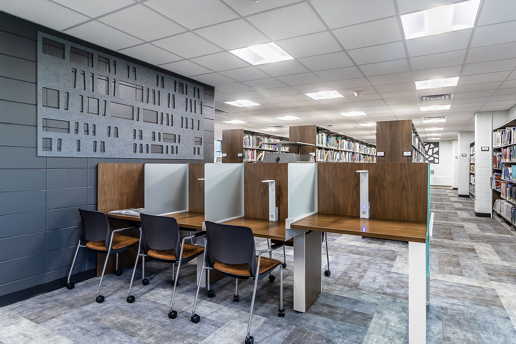 The Sault College Ron Doyle Library aims to provide innovative, high-quality services and resources in an atmosphere that supports the academic curriculum, facilitates student success, and assists in the development of skills for lifelong use of learning resources. To update a tired and out of date library space and introduce an improved, inviting common space for students, staff and public, Sault College began renovations to upgrade its 3-level Ron Doyle Library. The primary objective was to create a variety of multi-functional spaces where students and staff could gather for collaborative work, individual study, or visit within comfortable lounge settings to spend time between classes and access the myriad resources that a modern college library offers.