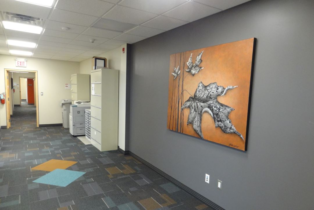 This diversified insurance company relocated its business to the second floor of a newly constructed building and was hoping to get a fresh look while maintaining their welcoming and friendly atmosphere that is their trademark. This design provided a functional layout, maintaining all program adjacencies while ensuring as much natural light as possible was provided throughout the space. The end result is a welcoming environment which includes a custom painted entrance door, a curved reception desk with unique ceiling system to mimic a skylight, vibrant colours, local artwork throughout and whimsical carpet accents.